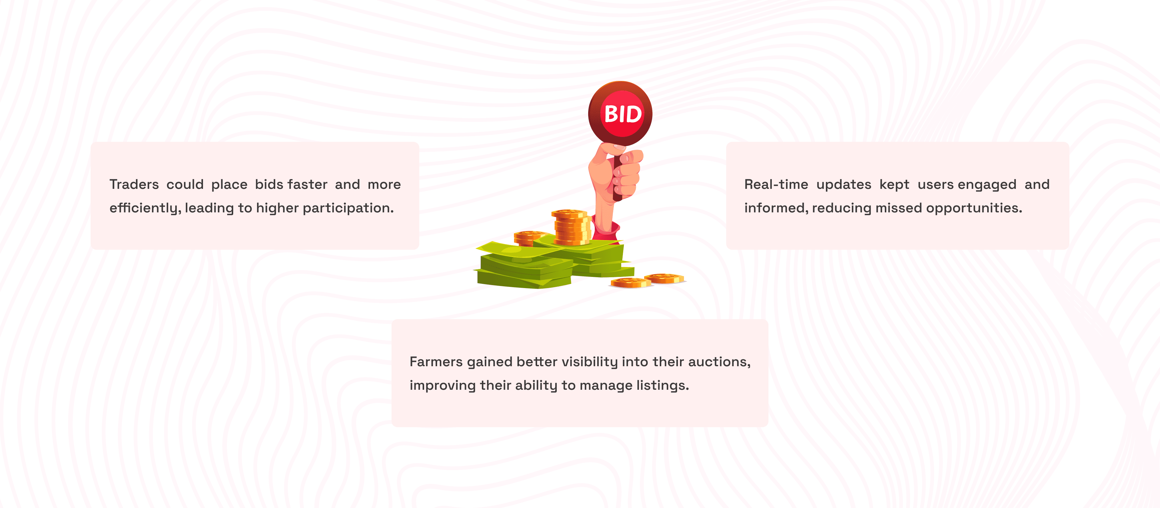 We simplified the bidding process with a quick bid option and added real-time updates, including a countdown timer. Farmers and traders gained a dashboard to monitor bid status, while the app was optimized for low connectivity. The interface was redesigned with a clean, card-based layout and clear visual cues, making it intuitive for all users.